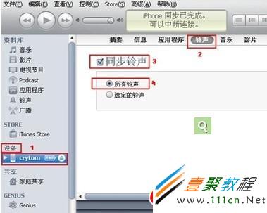 10.然後在“設備”裡打開“iphone”選擇“鈴聲”,在“同步鈴聲”項打鉤,選擇“所有鈴聲”,或者“選定鈴聲”,然後選擇“同步”,即可