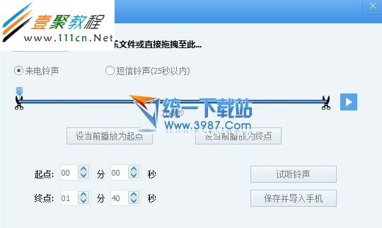 4、這時候可以看到如圖所示的畫面,點擊“選擇音樂”,選擇你要制作的音樂,還可以選擇是來電鈴聲還是短信鈴聲,再設置一下播放的起點以及終點