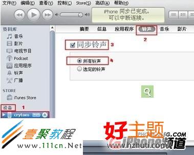 10.然後在“設備”裡打開“iphone”選擇“鈴聲”,在“同步鈴聲”項打鉤,選擇“所有鈴聲”,或者“選定鈴聲”,然後選擇“同步”,即可