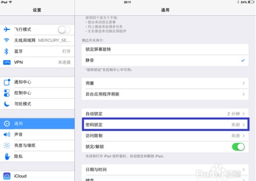 2.在設置列表中左窗格中點擊“通用”選項,然後再點擊右邊的“密碼鎖定”選項,如圖所示