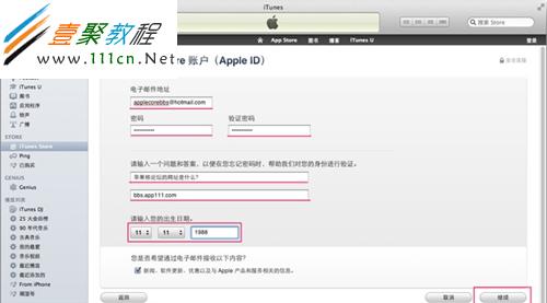 6.每一項都要填寫。這裡注意密碼設定是要有大小寫字母以及數字組合的,例如:Applecore111。都填寫完畢,點繼續。