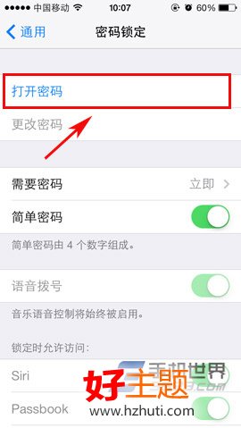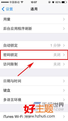 2)在“通用”菜單界面,大家就可以看到“密碼鎖定”功能了,點擊進入,然後點擊“打開密碼”。(如下圖所示)