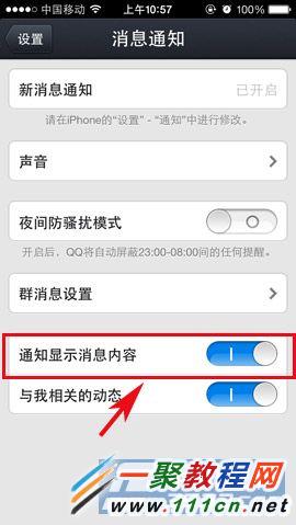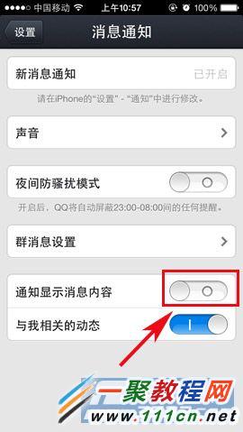 2)在“消息通知”界面大家就能看到有個“通知顯示消息內容”的按鈕了,大家只需要關閉該項功能即可,關閉後接到的手機QQ相關信息就只會是信息提示,而不會彈出相關的信息內容來了。(如下圖所示)