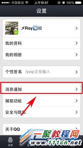 1)首先,進入手機QQ,然後點擊右下角的“設置”按鈕,在“設置欄”裡選擇“消息通知”功能進入。(如下圖所示)