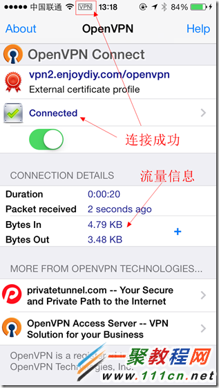 連接成功後,會有一些提示,比如流量和時間,點擊那個+符號會有更加詳細的說明,包括服務地址和本地獲取到的ip地址,連接成功後基本和官方的pptp等服務提示是一樣的。