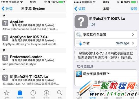 3、好了我們的源加好之後再在“同步收集助手源”就會有一個“同步afc2補丁 iOS7.1.X”,選擇並安裝。