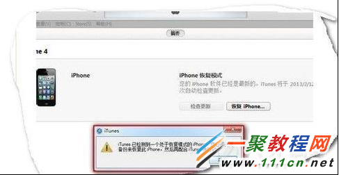 3. 現在我們此時再把按住開機鍵的手松接並且home鍵盤繼續按著,直到電腦出現DFU模式聯接.itunes出現恢復提示