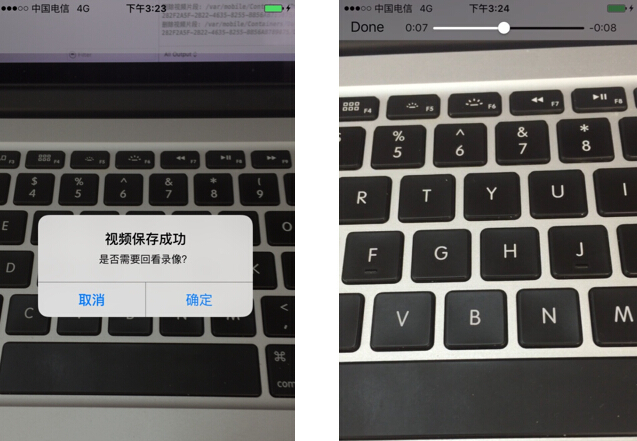 (3)點擊“保存”按鈕,或者總時長到達15秒時,則停止繼續錄像。程序會將各個視頻片段進行合並,並保存到系統相冊中。