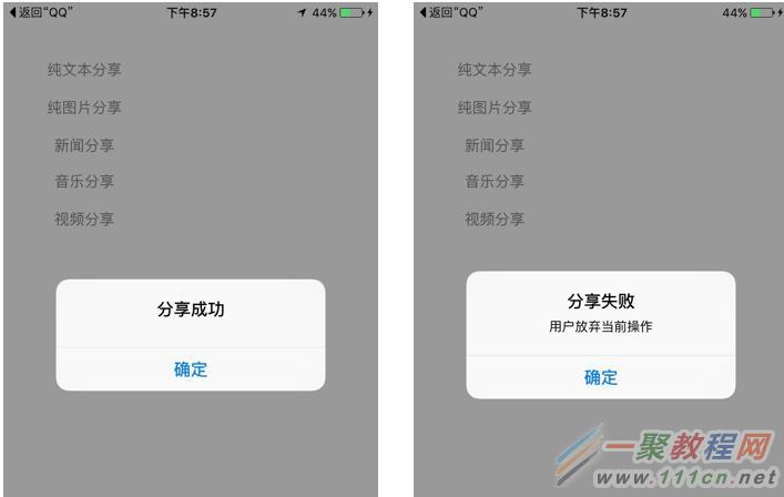 當分享消息完畢,返回應用時,我們應用中會顯示是否分享成功的提示。如果分享失敗,還會附帶上失敗原因。