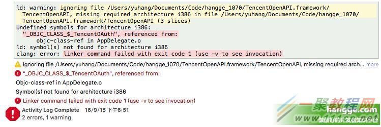 ld: warning: ignoring file /Users/yuhang/Documents/Code/hangge_1070/TencentOpenAPI.framework/TencentOpenAPI, missing required architecture i386 in file /Users/yuhang/Documents/Code/hangge_1070/TencentOpenAPI.framework/TencentOpenAPI (3 slices)