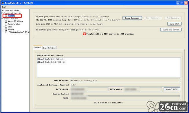 注意:目前64位處理器設備(iPhone5S/iPad mini2/iPad air)還無法使用小雨傘設備SHSH,左側Connected Devices也會出現無法識別狀態。
