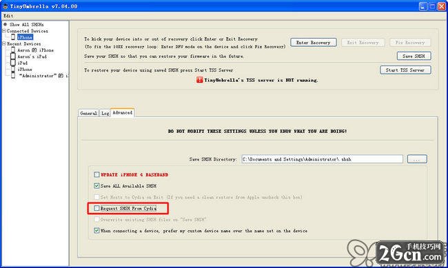 3.點擊【Advanced】,取消勾選【Request SHSH From Cydia】