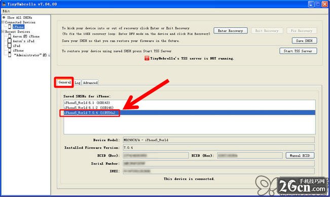 5.點擊【General】顯示成功備份iOS7.0.4 SHSH