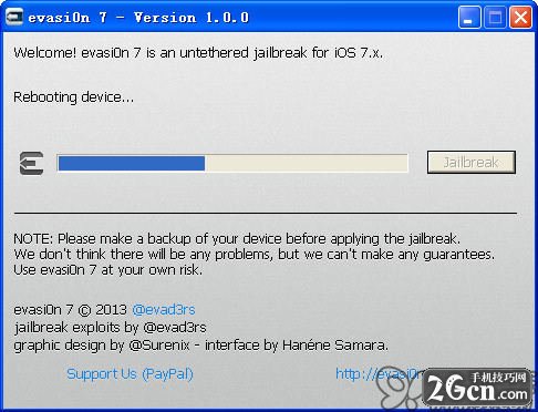 2.如果越獄過程在某個流程卡住了,可以進行以下操作讓程序繼續運行:重啟evasi0n程序,並重啟設備(如果有必要的話,可以同時按住Home鍵和電源鍵,直到設備停止運行)