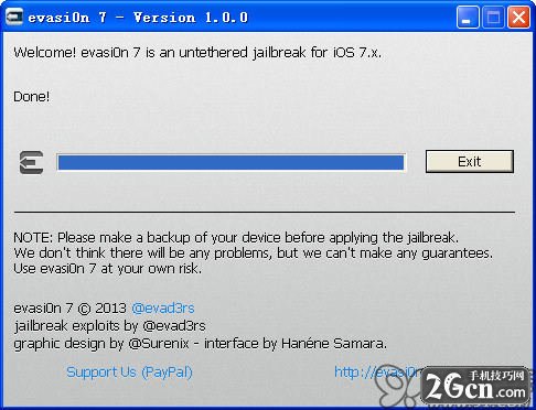 5.點擊evasi0n7圖標後設備會再一次重啟,接著工具會自動運行,直至PC端evasi0n顯示Done!(如圖所示),此時千萬注意先不要動設備,不要拔掉數據線,然後等待設備自動進行相關越獄操作步驟,最後設備會再一次自動重啟。