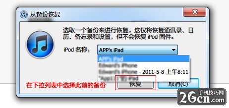 5、大約三分鐘左右的時間,我們的設備就已經更新到了iOS7系統,最後一步是將備份的數據恢復到新系統中,鼠標右鍵點擊設備的名稱,選擇“從備份中恢復…”: