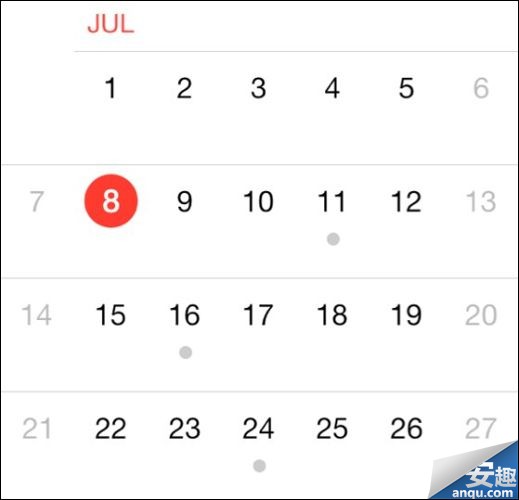 日歷:在月歷模式下,當某天有事件記事則會在日期下顯示灰色的圓點。
