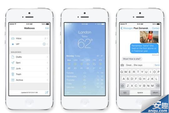 A:北京時間6月11日凌晨1點整蘋果在美國舊金山芳草地藝術中心舉行蘋果WWDC2013開發者大會,正式發布了全新的iOS7操作系統。正如我們之前所料,全新的iOS7操作系統相對之前的版本在界面風格上進行了大幅度的改變,包括扁平化的圖標、下拉通知的改變、解鎖方式的變動、動態天氣的改觀等等。下面我們就通過圖片來欣賞一下全新iOS7系統吧!