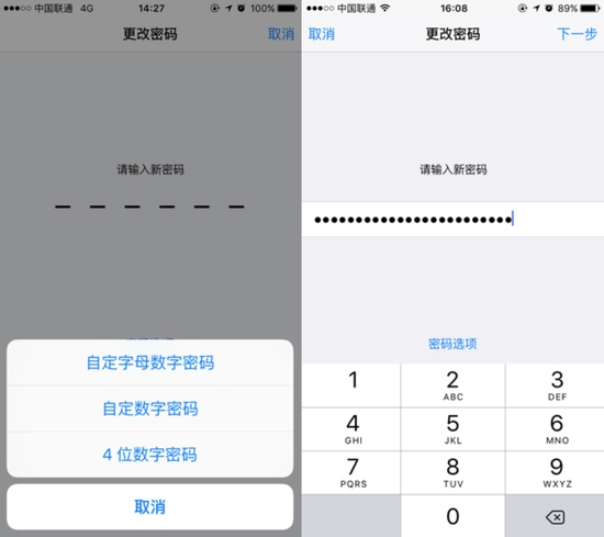 關於iOS 9的密碼設置選項,可能多數人聽說的是改為6位了,實際上,在自定數字密碼和自定字母數字密碼兩個選項中,你設置10位、20位都沒有問題,只要你記得住。