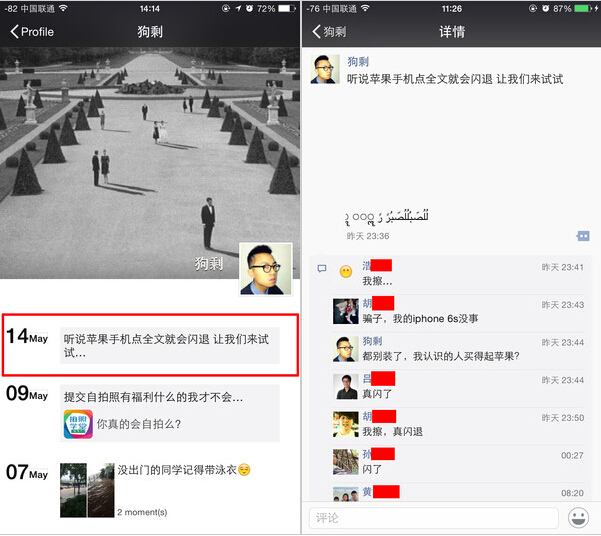 iPhone微信閃退代碼很簡單,你只需要在你的朋友圈發一條簡單的信息(注意要使用Android手機版微信發送,否則自己也會卡死),吸引iPhone用戶來點擊,然後,就沒有然後了,那堆iPhone的微信全部陣亡。無論他們心有不服,再次點擊進來,也會同樣遭遇閃退的尴尬。經過實測,幾乎每一個點擊查看該消息的iPhone用戶都會閃退。