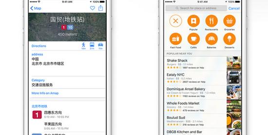 這種智能化在過往風評不佳的地圖上也得到了體現。iOS 9中的地圖在搜索時,會看到包括餐飲、購物和娛樂地點信息的列表,每條列表還有詳細的分類,比如餐飲下分為熱點、餐館、食品雜貨、快餐、咖啡館、面包店等 不同類別。另外,公共交通查詢的功能也加入到地圖中,可以幫助用戶規劃公共交通的路線,支持中國的大部分城市,雖然這在國內的地圖應用中已經屢見不鮮,但 聊勝於無,至少讓用戶少一個安裝第三方地圖應用的理由。而對地圖功能的智能化改進,也顯現出了蘋果對公共資源、商家資源整合的野心,這種野心在Apple Pay和HomeKit中表現最為明顯。