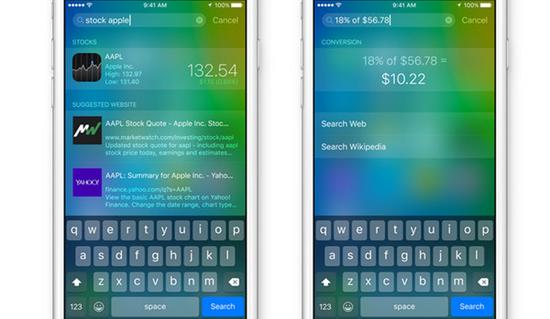 得益於Siri的提升和Proactive Assistant的推出,Spotlight搜索功能也獲得了實質的進步,可以調用應用程序得出搜索結果,並加入Siri建議,比如在搜索框中輸入某個 球隊的名字就會顯示該球隊最近的比賽成績、輸入某上市公司名字獲得最新股票信息、輸入數學公式直接顯示結果等,而且這個API是對開發者開放的,開發者對 應用進行升級後其信息也可以在Spotlight中被查找到。