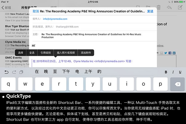 iPad在文字編輯方面擁有全新的Shortcut Bar,一系列便捷編輯工具,一種以Multi-Touch手勢選取文本的便利新方式,以及經過優化的中文自動更新功能,你可以盡情揮灑文字。