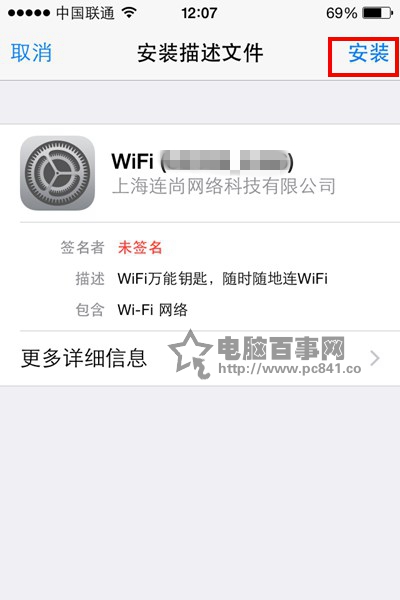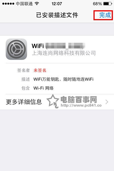 7,再接下來,我們點擊如何一個有藍色鑰匙標識的wifi熱點,安裝描述文件,點擊一下右上方的安裝,會彈出對話框,再次點擊一下安裝,安裝完之後點擊一下完成,如下圖所示: