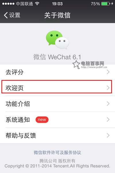 5,再接下來,我們在關於微信界面的下方點擊一下【歡迎頁】,如下圖所示: