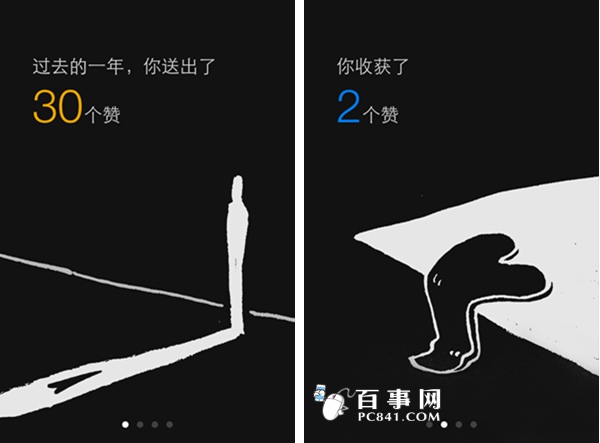 6,最後我們便可看到點贊數據統計界面,我們會看到在過去的一年,你送出了多少個贊以及你收獲了多少個贊。筆者一年來關注微信的比較少,跟那些經常點贊的朋友無法匹敵。