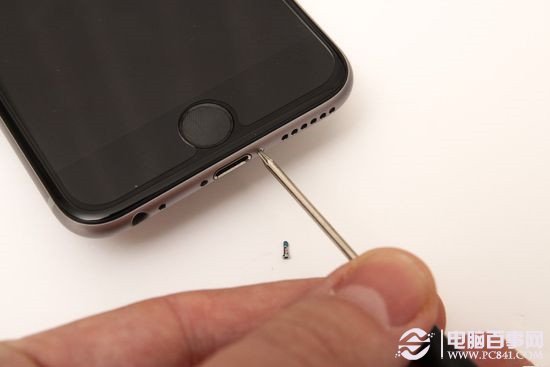 第3步:關掉手機電源使用工具包裡的五角形螺絲刀擰下螺絲。螺絲刀的頭部很小,但它跟 iPhone 6底部的小螺絲是匹配的