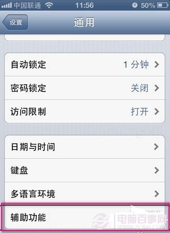 2、用三個手指向上滑動,找到下面的“輔助功能”,輕按一次選中,再按二次進入“輔助功能”選項;