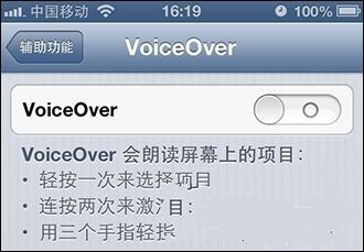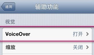 3、然後在“輔助功能”中輕按一次來選中的“VoiceOver”,再按二次進入開關切換選項。