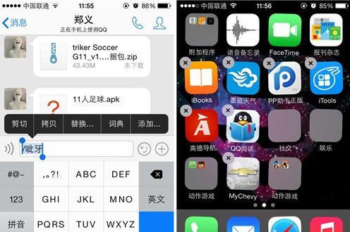 第二步:選好之後我們就可以退出QQ了,之後選中某個應用文件夾,長按該文件夾幾秒,該文件夾就會晃動起來,之後打開應用,點擊上方右側的刪除圖標,刪除文件夾名稱,之後點擊屏幕然後選擇粘貼前面拷貝的內容。