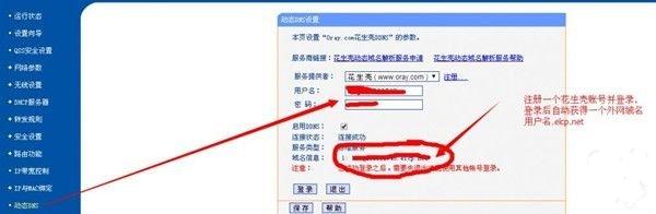 3.設置花生殼動態dns,進去注冊一下登錄就可以。成功登錄後,要記住圈圈裡的那個域名,後面設置要用。