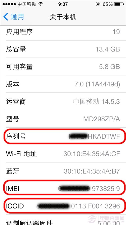 第1步 新購買的iPhone,請進入手機桌面上的“設置”-“通用”-“關於本機”,對手機的各種產品碼截圖保存,如下圖: