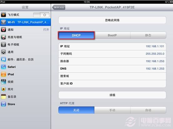 上圖中所示為IPAD自動獲取的IP地址等參數。