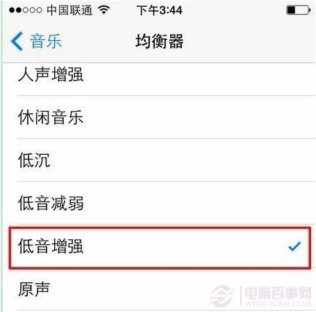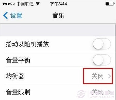 3、然後,點擊“均衡器”,在均衡器中選擇一種你手機裡的音樂最多的類型(Rock,R&B,流行,這些對於大多數歌曲都是很適合的歸類選擇)