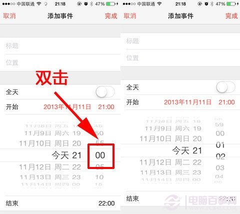 打開《日歷》APP後,新建一個時間,然後進入編輯界面調整時間,這時候還只能按5分鐘來調整。但是只要用手指雙擊分鐘欄的數字,大家就會看到調整的幅度變為1分鐘一次,可以精確的調整時間了。