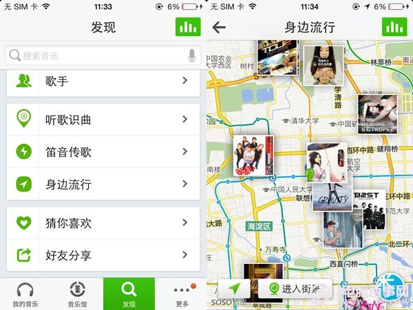 不久前,QQ音樂新版在App Store上架。這次新版增加的新功能中最亮眼的莫過於,通過地圖和街景來發現附近的熱門音樂。打開QQ音樂,在界面的底部有一個“發現”選項,點擊進入後選擇“身邊流行”,這時界面就會出現一張地圖,在上面會有懸浮的小圖片來顯示在你附近使用QQ音樂的用戶所聽的音樂。