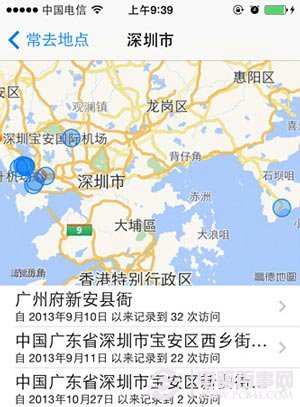 通過下圖我們可以發現,iOS7會通過地圖標識與文字記錄用戶常去的地址。什麼時候去,去過幾次,具體位置在哪裡等都一目了然,個人行蹤信息就這樣赤裸裸的呈現在我們眼前。