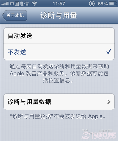 3、通用--關於本機--診斷與用量。 選擇不發送,這個選項在激活的時候會彈出來,一般都會選擇不發送。如果選擇自動發送的話,手機使用中出現的系統問題它都會自動記錄下來,然後自動發送給蘋果服務器,這個也是個耗電元凶,建議關閉。