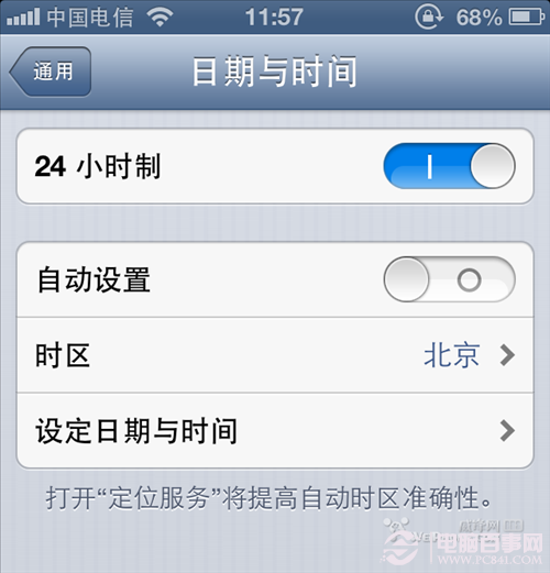 2、設置--通用--日期與時間。 把自動設置關掉,否則手機終端會一直搜索現在你的位置,然後根據位置的不同自動調整時間。(雖然這是一個非常人性化的功能,但是我們通常用不到,這個也非常非常的費電!以至於有些FY發現自己手機的待機時間和使用時間一樣,罪魁禍首就是它!)