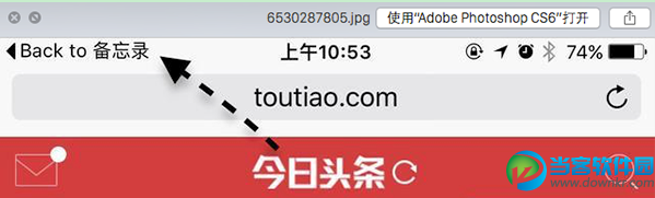 如下圖所示,在 Safari 中打開了頭條的頁面以後,在屏幕的左上角可以看到有一個 Back to 備忘錄的選項按鈕,點擊它即可返回之前的備忘錄應用,非常方便。