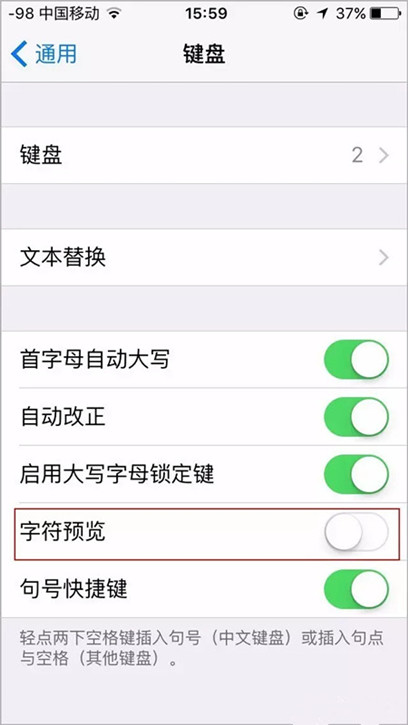進入設置-通用-鍵盤-字符預覽,把這個開關打開,輸入的時候就沒有放大的預覽了!