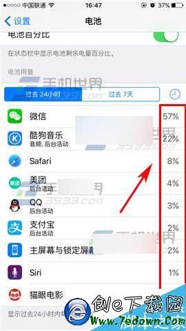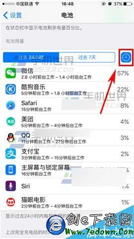 2)打開後我們揭開查看各應用消耗的電量了,點擊右邊的那個時鐘還可以查看到後台工作時長哦!(如下圖)