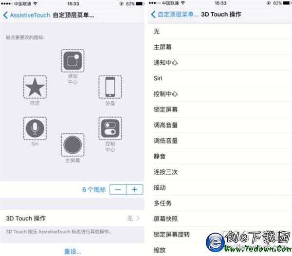 前往“設置”-“通用”-“輔助功能”-“AssistiveTouch”-“自定頂層菜單”-“3D Touch操作”,選擇想在AssistiveTouch上用3D Touch執行的操作。可選操作有很多,包含主屏幕、通知中心、靜音、多任務這樣的常用功能。
