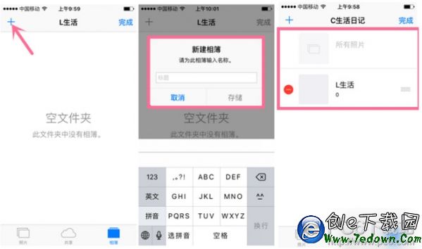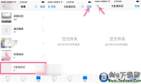 6、進入第5步中新增的文件夾,繼續點擊“編輯”,這裡輕輕點下左上角“+”就出現“新增相薄”,點擊“選擇”就可以開始整理照片了。(長按“+”也可以看到“新增相薄”)