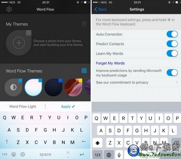 而且在個性化鍵盤設置的時候,微軟提供了非常非常詳細的設置,用戶不光可以自定義鍵盤背景,甚至連每個字符按下的時候顯示的顏色都能更改。同時,你還可以自定義設置WordFlow的背景,包括使用應用內置的圖片,或者使用自己喜歡的圖片。所有的主題圖片都免費開放,並且還將持續加入新的主題