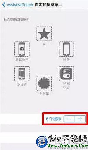 打開【Assistive Touch】-點擊【自定頂層菜單】功能,即可按照自己需求自定義想要的快捷鍵至小圓點頂層菜單,點擊下方面的“+”號,可以增加自定義的快捷鍵最多至8個,非常方便。